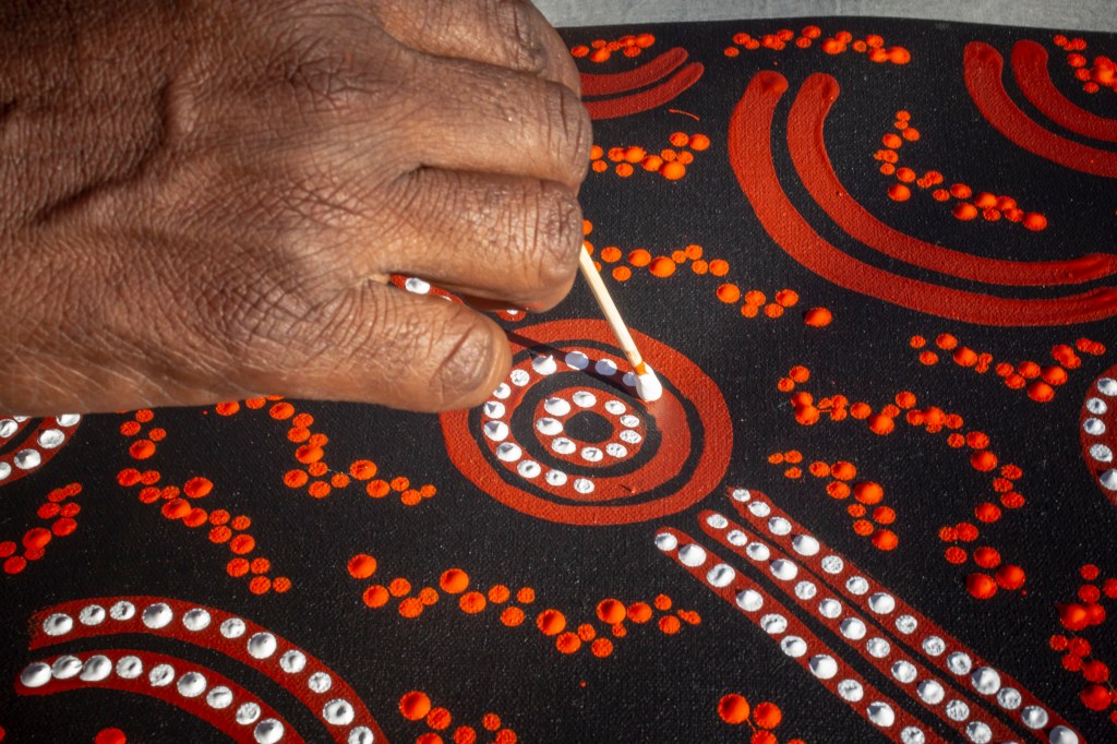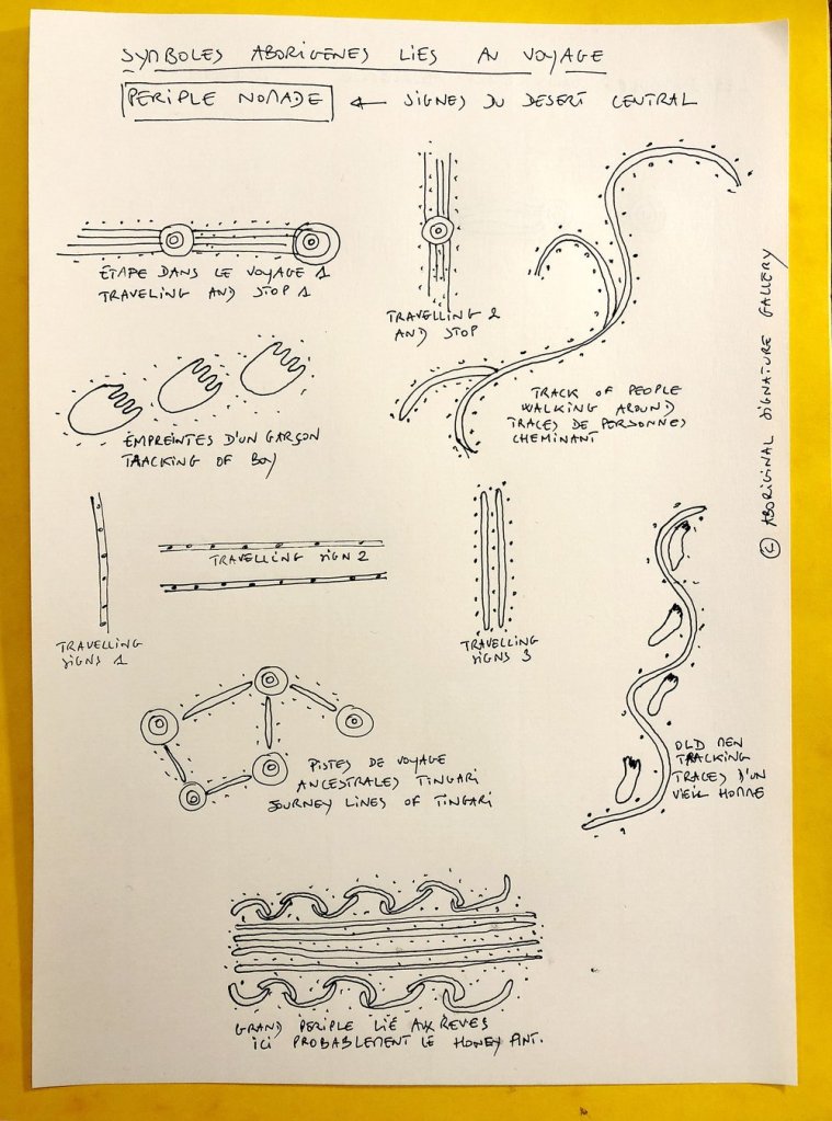 Les signes indigènes australiens existent depuis la nuit des temps, expression souvent galvaudée, mais clairement pas concernant les aborigènes. Cela fait près de 60 000 ans que ces signes porteurs de la plus ancienne mémoire d’un peuple intriguent les explorateurs. Ce sont les peintures rupestres, sur la roche, qui sont parvenues jusqu’à nous, mais cet art se faisait également sur le sable, les écorces d’arbres et d’autres supports éphémères. On parle même de peintures au sol s’étendant sur des kilomètres, un peu comme Nazca au Pérou, réalisées lors de rites et aujourd’hui disparues.