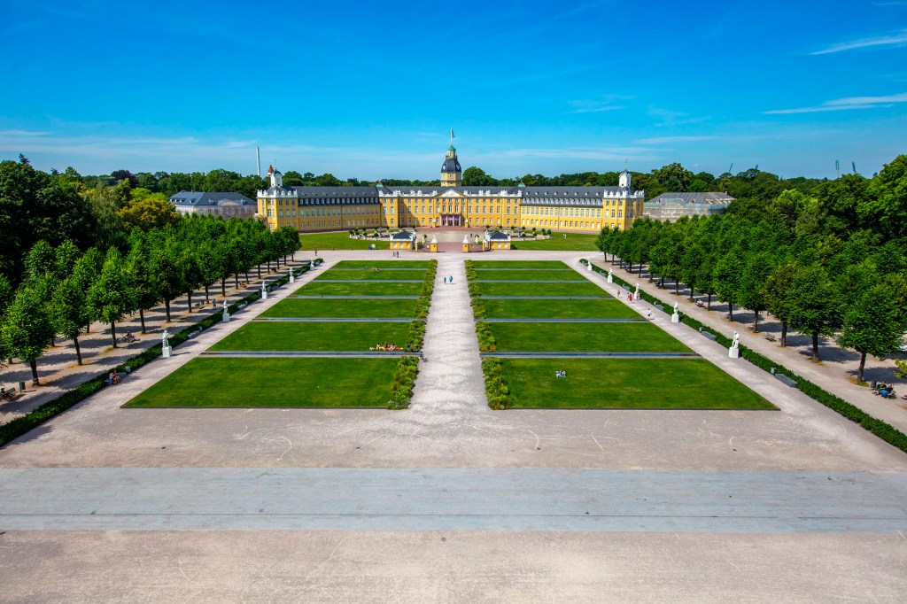 En français, Karlsruhe signifie littéralement « le repos de Charles ». Pourquoi ce nom ? Il raconte tout simplement l’histoire de cette ville originale fondée il n’y a pas si longtemps, en 1715, par un certain Charles-Guillaume, margrave (une sorte de marquis) du Bade-Durlach, l’un des Etats du Saint-Empire romain germanique. Alors qu’il s’était endormi dans la forêt au cours d’une chasse, il rêva d’un château éblouissant comme un soleil, et d’une ville dont les rues en seraient les rayons. Ainsi est né Karlsruhe, la cité en éventail, selon les plans de son fondateur, dont la tombe repose sous une pyramide en centre-ville. Le château de Karlsruhe est ainsi le point de départ de 32 rues et allées qui forment un éventail, comme des rayons de soleil ! Ce majestueux palais a d’ailleurs pour modèle le château de Versailles, la demeure du roi Soleil, logique !