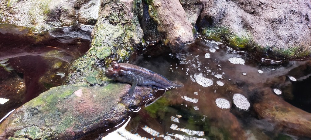 On y trouve donc le poisson archer, qui crache jusqu’à 2 mètres de haut sur les insectes qui volent au-dessus, et ne rate jamais sa cible ! Son camarade l’anableps a carrément quatre yeux, deux sur le dessus de l’eau et deux en-dessous, qui lui permettent de voir à la fois sous et hors de l’eau, pratique ! Encore plus fort, le périophtalme : un poisson qu’il ne faudra pas forcément chercher sous l’eau, car il se promène aussi sur la terre ferme ! Surnommé poisson-grenouille, il possède une respiration cutanée (par la peau) qui lui permet de vivre provisoirement à l’air libre. Puis quand il retourne à l’eau, il reprend l’option branchies… Soyez patient et prenez le temps d’observer le bassin, en attendant son prodigieux saut qui le propulse hors de l’eau, sur un rocher !