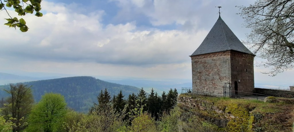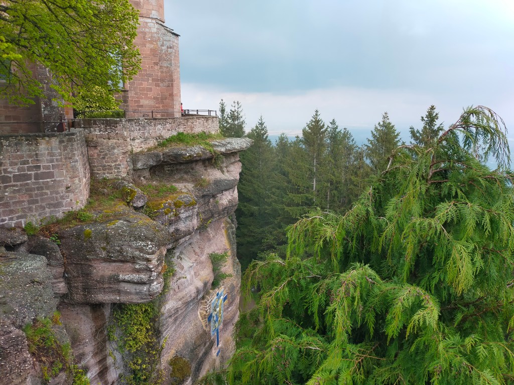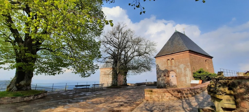 Situé à une vingtaine de km plus au sud, le château du Haut-Koenigsbourg présente beaucoup de similarités avec le couvent du Mont Sainte-Odile : un édifice de grès rose construit à flanc de montagne au sommet d’un massif vosgien, surplombant la plaine d’Alsace. Même l’altitude est sensiblement la même : 755 mètres, contre 753 mètres pour le Mont Sainte-Odile…