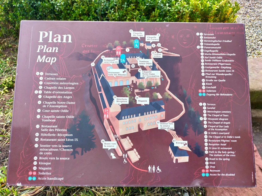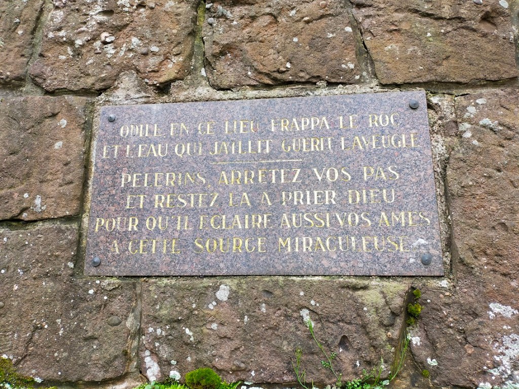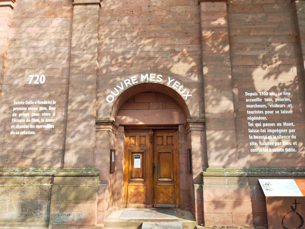 « En 720, Sainte-Odile a fondé ici le premier monastère, lieu de prière pour vivre à l’écoute de dieu, le louer et chanter les merveilles de sa création. Depuis 1300 ans, ce lieu accueille tous, pèlerins, marcheurs, visiteurs et touristes pour se laisser regénérer. Toi qui passes au Mont, laisse-toi imprégner par la beauté et le silence du site, habité par Dieu et confie toi à Sainte-Odile. » En effet, en 2020, on vient de célébrer les 1 300 ans du sanctuaire.