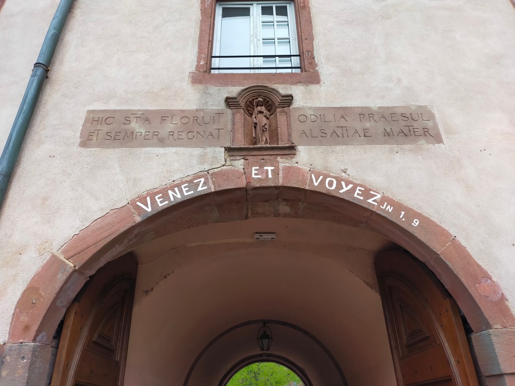 Venez et voyez, évangile selon Saint-Jean, chapitre 1 verset 9, bien approprié à Sainte-Odile qui retrouva la vue et qui attire ici les aveugles espérant une guérison miraculeuse. Au-dessus, on aperçoit la statue de Sainte Odile avec le bandeau sculpté de la phrase en latin : Hic Sta Floruit Odilia praesul et semper regnat alsatia mater qui pourrait se traduire par ici fleurit jadis la sainte Abbesse Odile, elle règne en mère de l’Alsace.