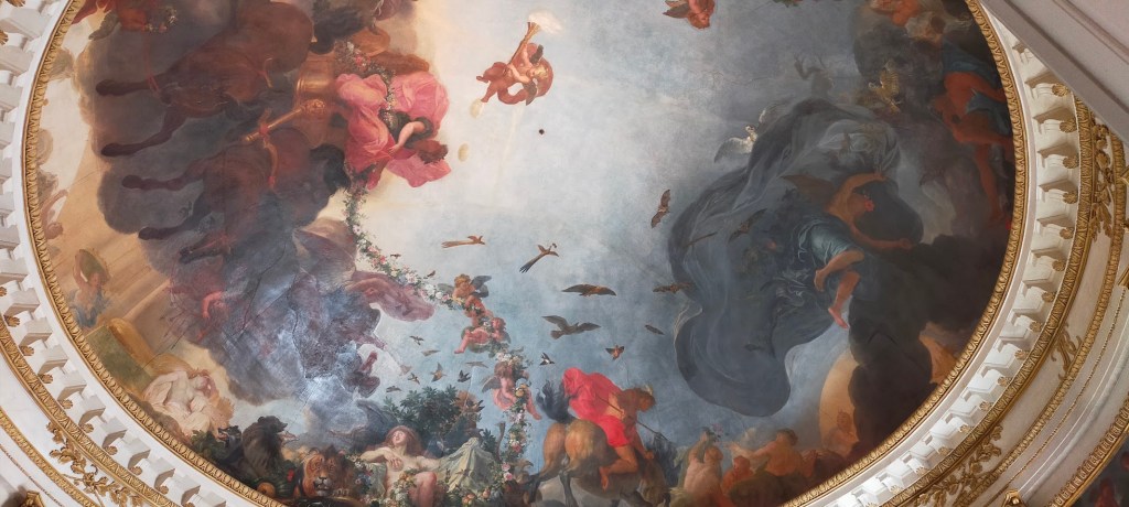 Au plafond de la voûte du pavillon, Charles Le Brun, le peintre et décorateur de Louis XIV, a peint L’Aurore sur son char chassant la Nuit, chef-d’œuvre réalisé vers 1673. La figure de l’Aurore prend place sur son char, précédent celui du Soleil qui s’apprête à se lever. Le char de l’Aurore s’oppose à la Nuit qui lui fait face de l’autre côté de la composition. Elle est représentée avec son voile sombre d’où surgissent les Rêves, les monstres et autres créatures. De part et d’autre, on aperçoit sur leur cheval Castor et Pollux, entourés d’un cortège d’allégories illustrant les saisons, les 12 signes du zodiaque et les jours le long de la corniche. Levez la tête et amusez-vous à les repérer ! Cette peinture a également un sens politique. L’Aurore, symbolisant Colbert, prépare l’arrivée du Soleil, emblème du roi Louis XIV. La visite de ce pavillon est fortement recommandée, d’autant qu’un casque virtuel vous révèle tous les passionnants secrets de la peinture de Le Brun.
