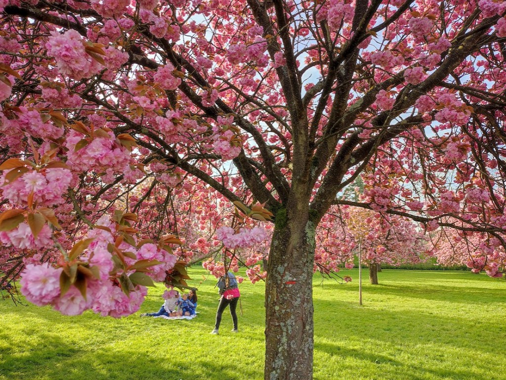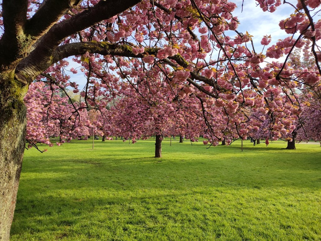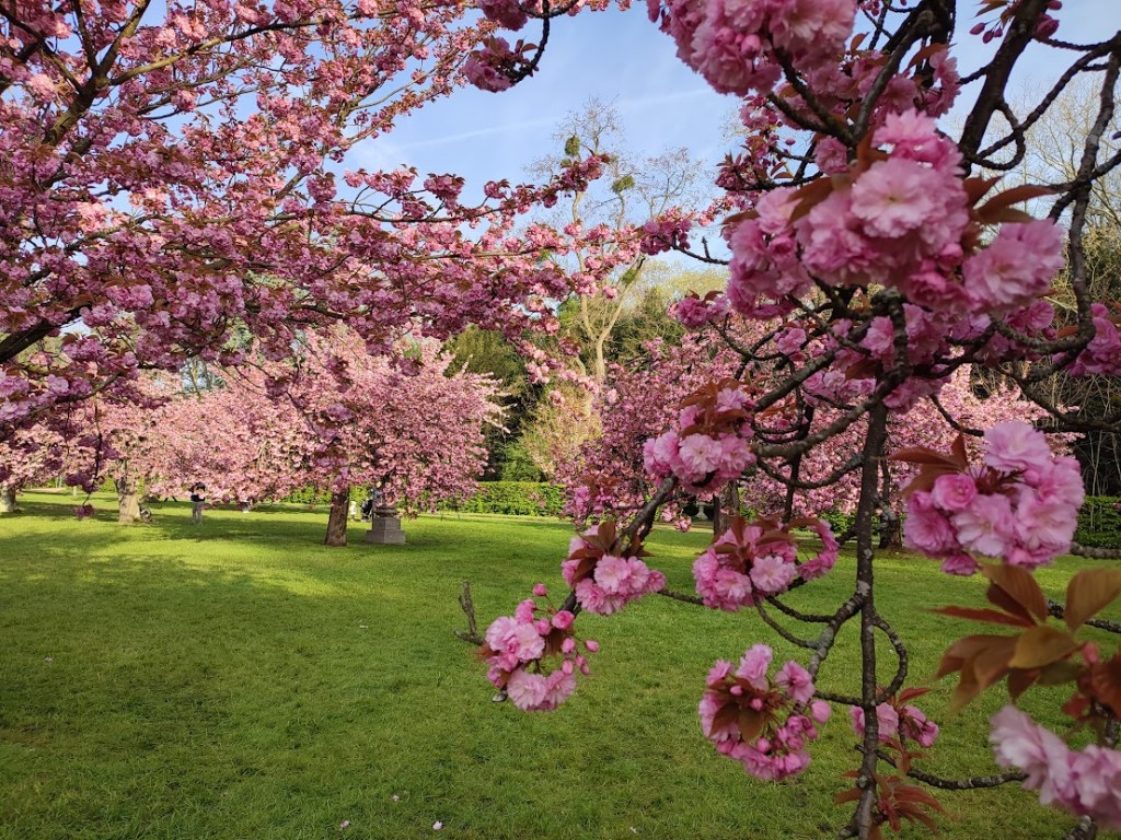Situés de part et d’autre de la plaine de Châtenay, les bosquets de cerisiers nord et sud sont réalisés lors du grand chantier de restauration du Domaine de Sceaux par l’architecte Léon Azéma, dans les années 1930. On lui doit déjà le pavillon de Hanovre et les Grandes Cascades Art Déco. Ces bosquets n’apparaissaient donc pas dans le dessin du jardin imaginé par André Le Nôtre. Le bosquet sud, constitué de 104 cerisiers aux grosses fleurs blanches (Prunus avium Plena), entre en résonnance avec le bosquet nord, planté de 154 cerisiers (Prunus serrulata Kanzan) quasi centenaires, donnant de magnifiques fleurs roses en avril. La floraison des 104 cerisiers est très attendue, mais très éphémère : elle ne dure qu’une dizaine de jours, il ne faut pas rater son coup, ni venir trop tôt, ni trop tard ! Cette floraison donne lieu à la fête « Hanami », littéralement « regarder les fleurs », qui attire beaucoup de monde, notamment de nombreux Japonais, adeptes de cette coutume ancestrale de leur pays. Inutile de guetter les cerises, ces arbres d’ornement ne donnent pas de fruits.
