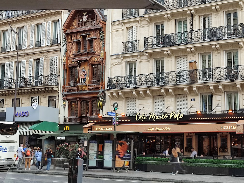 Durant les beaux jours, on s’installe en terrasse en admirant juste en face une étonnante façade d’un immeuble en bois tout droit sortie d’Alsace ! Classée monument historique, cette ancienne brasserie alsacienne construite en 1892 abrite aujourd’hui un Mac Do ! Mais quittons le 119 rue Saint-Lazare et retournons au 108 rue Saint-Lazare, où se trouve notre bien nommé Quai 108.