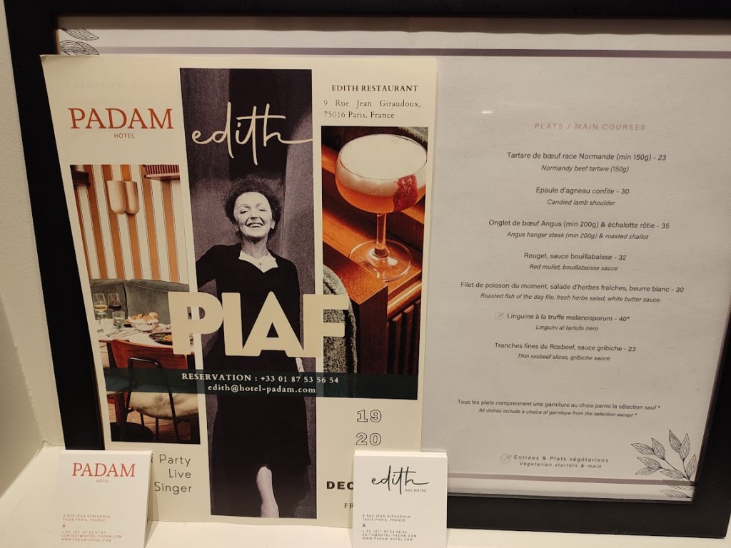 Padam, padam, padam… impossible de ne pas fredonner le refrain de cette célèbre chanson d’Edith Piaf en arrivant devant le Padam, tout nouveau boutique hôtel situé dans le triangle d’or à deux pas des Champs-Elysées. Surtout quand on s’y rend pour assister à la dernière des trois soirées Edith Piaf organisées dans son restaurant, le bien nommé « Edith » !