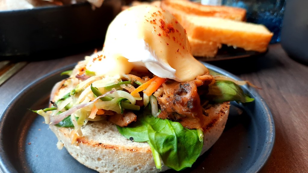 - Œuf Bénédicte sur muffin anglais, avec saumon fumé ou bacon ou végétarien : le point d’orgue de ce brunch !