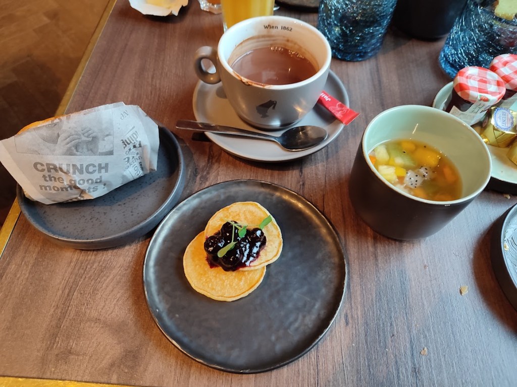 - Viennoiseries : Mini croissant, mini pain au chocolat, pancake aux myrtilles (un délice !), assortiment de pains, beurre grand cru Lescure de Poitou-Charentes, confiture.